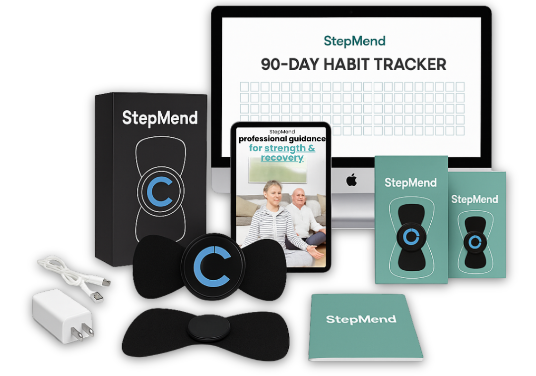 Complete system includes: Stepmend EMS device, 2 medical-grade adhesive pads, USB charging cable, wall adapter, user manual, quick-start guide, recovery eBook (digital), and 90-day habit tracker (digital).